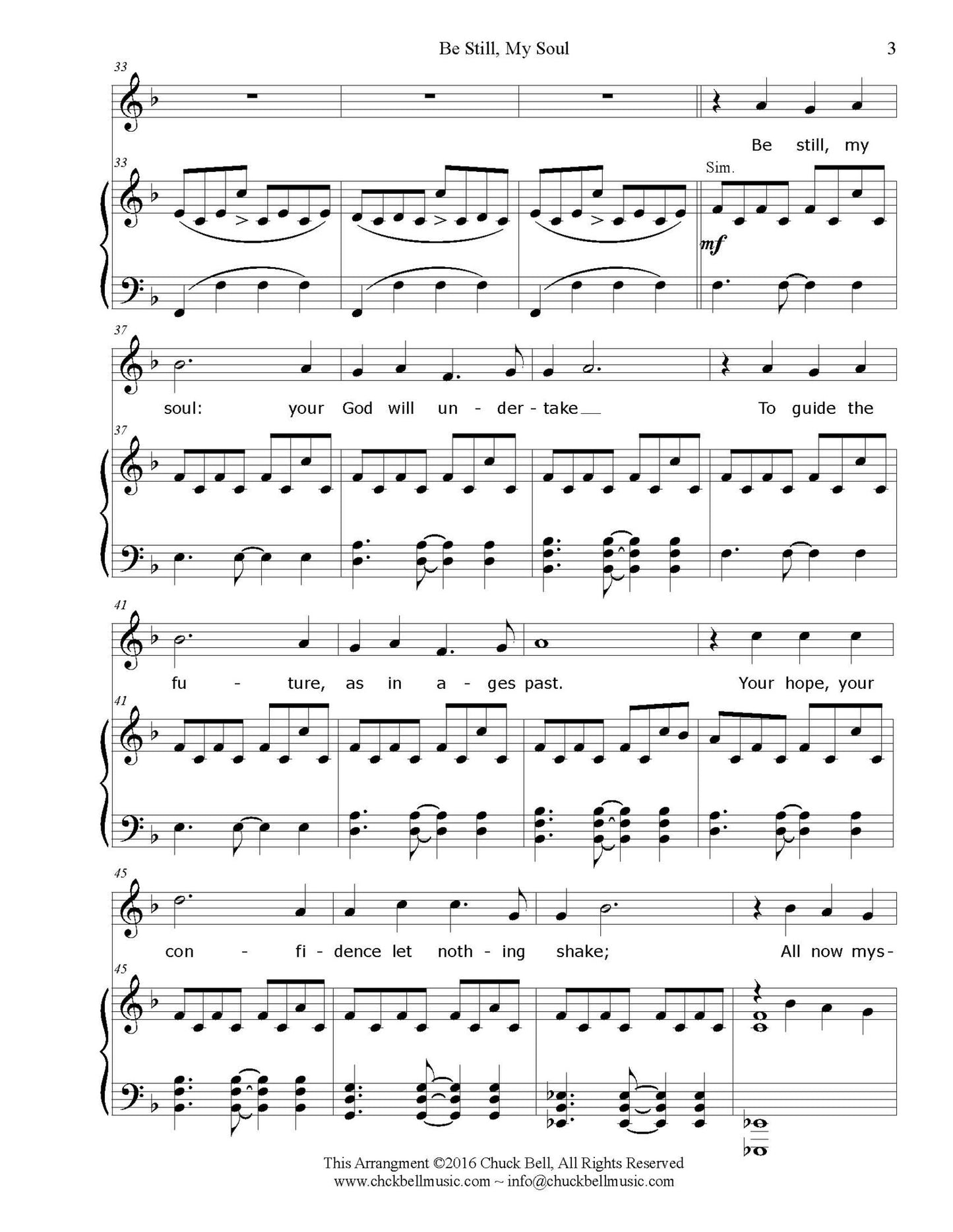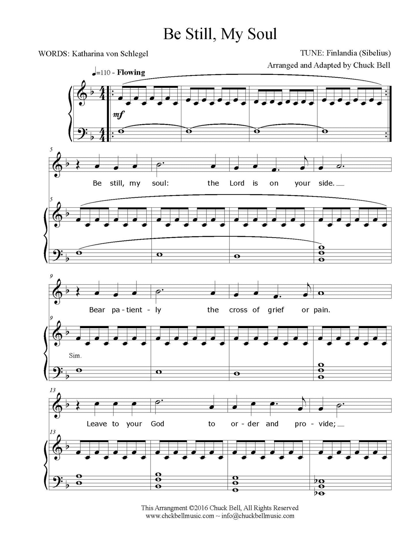 Contemporary arrangement of the hymn "Be Still My Soul" set to the Finlandia tune. Strong piano accompaniment stable enough to be used with congregational singing or to support a soloist. Arrangement also works with a full band or could also be used as a stand alone piano piece. The three verses noted are from the United Methodist Hymnal - #534